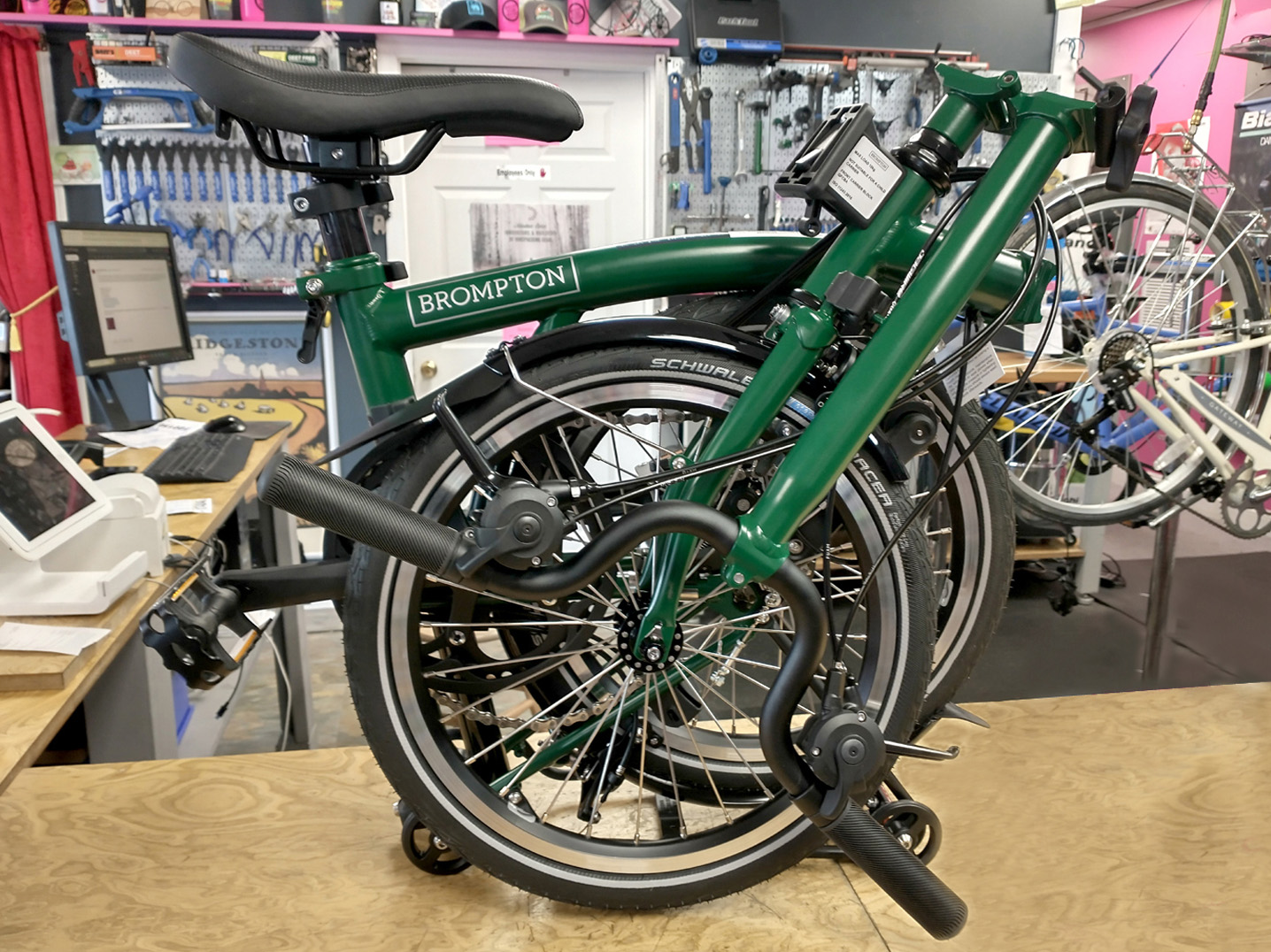 swing on by if you'd like to come check them out in person. we don't know anywhere else in the USA outside of the two Brompton HQ factory stores in Brooklyn and Washington D.C. that have these two models in stock just waiting around for folks to ride em. so, make the drive to see us. we'd love to share what we know about all things Brompty (just call or email first to make sure they are here as we'd hate for you to waste a trip). and if you end up digging how either of these demo bikes ride, we can order you in one of your very own with all the customization's to reflect your personality and riding style in about a week (as long as Brompton USA has one in stock to sell).
